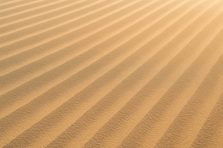 Golden desert sand showing finely combed texture with distinct parallel diagonal ridges created by wind patterns. natural abstract background.