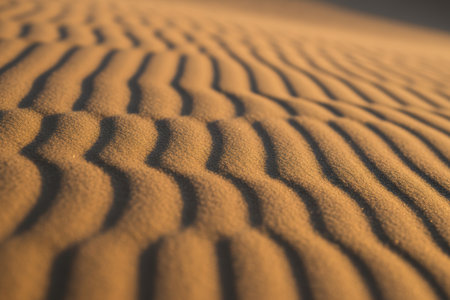 Detailed close-up of golden sand dunes showcasing parallel ripples and the interplay of light and shadow.