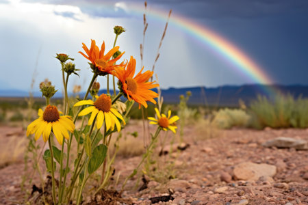 rain-soaked desert wildflowers with a rainbow in the background, created with generative ai