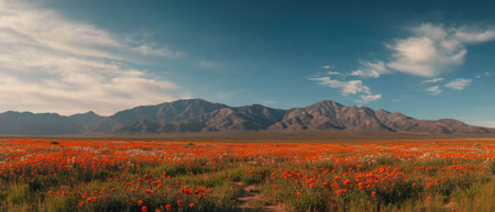 Sunset over a field of orange wildflowers in a mountainous desert landscape