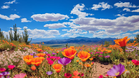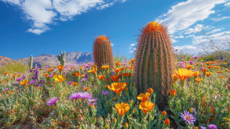 Cacti growing amidst a field of wildflowers in the desert, showcasing the contrast between the rugged, spiky plants and the delicate, colorful blooms