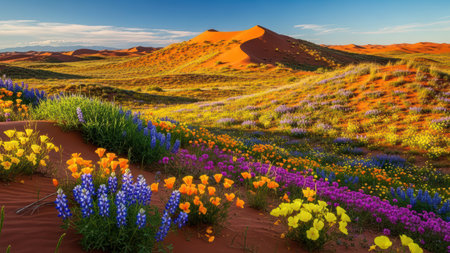 Breathtaking desert landscape with vibrant wildflowers and rolling sand dunes.