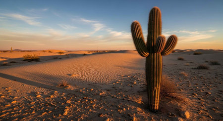 showing golden hour desert landscape with saguaro and cholla cacti and rippled sand dunes under a softly clouded sky. resolution