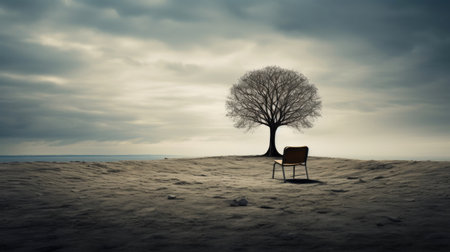 a tree and bench stand by the ocean, surrounded by a light sky-blue and dark gold color palette. this ethereal minimalistic scene, captured in 8k resolution, showcases desolate landscapes and embodies the prairiecore aesthetic. the cold and detached atmosphere creates a unique blend of metropolis meeting nature. ai generated