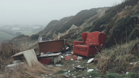 A striking image of an abandoned red armchair set against a misty landscape. The scene captures the neglect of furniture amidst nature, highlighting environmental issues.