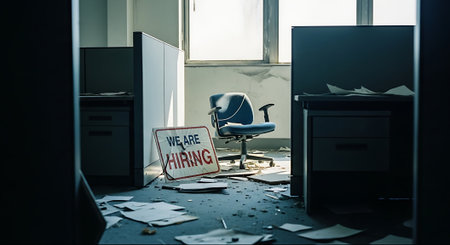 Abandoned office interior with sign We Are Hiring. Unemployment concept