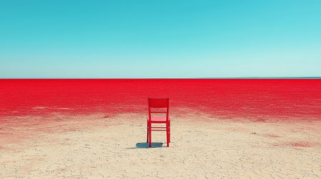 A striking image featuring a solitary red chair set against a vibrant crimson landscape, contrasting beautifully with a clear blue sky, evoking feelings of isolation and tranquility.