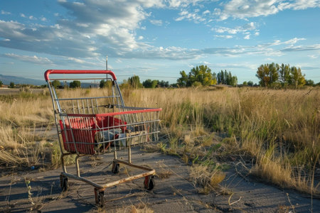 Rusty shopping cart is abandoned in an empty parking lot, overgrown with weeds, illustrating economic hardship