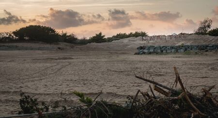 Dirty waste plastic garbage on the beach with outdoor sun low lighting.