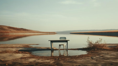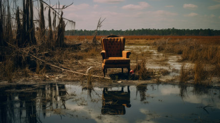 an old chair, reminiscent of southern gothic-inspired decay, sits in the middle of the water. this thought-provoking photo, taken with provia, captures the essence of environmental awareness and the decaying landscapes of the southern countryside. the dark orange and beige tones add to the haunting beauty of this theodore rousseau-inspired composition. ai generated