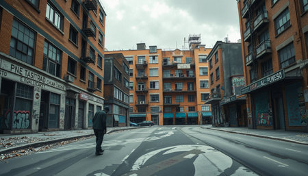 A person walks alone on a curving, deserted street, surrounded by tall brick buildings with evenly spaced windows. The buildings exhibit a warm orange hue while the ground is adorned with scattered leaves, hinting at an autumn setting. Graffiti covers the lower sections of the buildings, adding an urban and gritty feel to the scene. The sky above is overcast, casting a muted light and a somber tone across the image. Storefronts with faded signs line the street, suggesting a neighborhood that has seen more bustling days. Fire escapes are attached to the facades, providing a typical urban landscape feature, enhancing the atmosphere of a quieter, perhaps neglected urban environment.