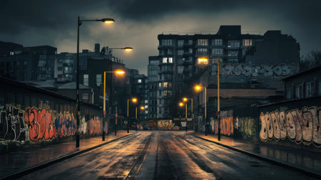 Night city street with buildings and graffiti. 3d rendering. Computer digital drawing.