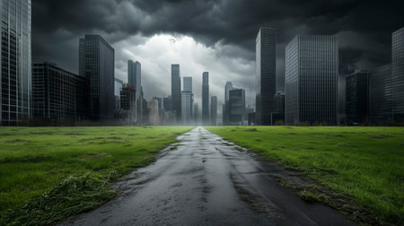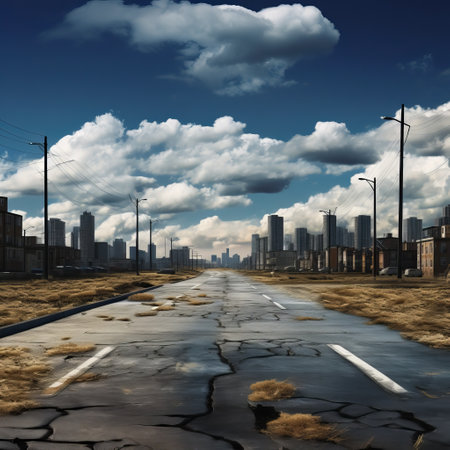 Backgrounds/ showing post-apocalyptic cityscape with cracked highway and abandoned skyscrapers under a dramatic stormy sky keywords: cityscape, post-apocalyptic,...