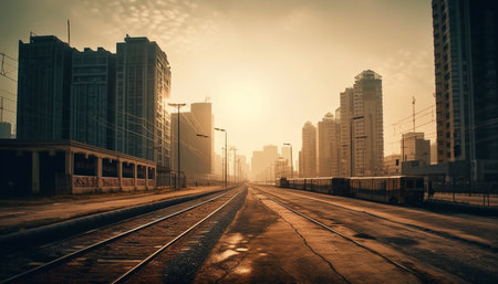 Abandoned industrial area of the city in the rays of the setting sun, Realistic Post Apocalypse Landscape