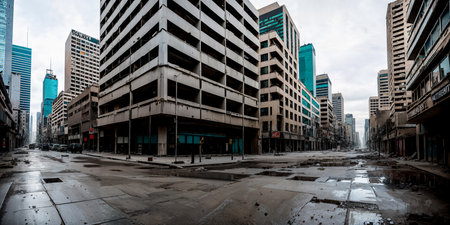 Panoramic daytime view of a modern cityscape in ruins an apocalyptic high angle perspective