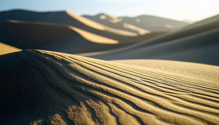 Waves of golden sand rise and fall across an expansive desert, glowing under a clear blue sky. The tranquil landscape invites a sense of calm and adventure, showcasing natures beauty.