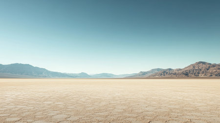 Expansive view of a flat desert foreground stretching towards a mountain range under a dynamic sky, perfect for illustrating the scale and emptiness of desert environments.