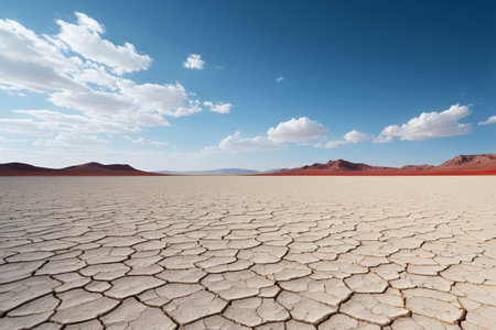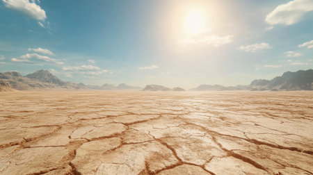 A striking image capturing a dry and cracked landscape under the bright sun with mountains in the distance, showcasing the effects of drought and environmental change.