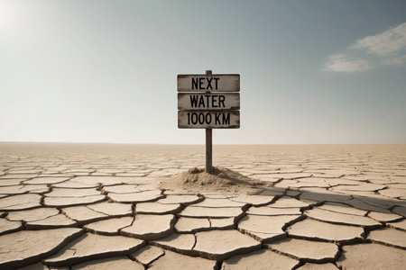 A wooden sign stands alone in a desolate, cracked landscape. The inscription warns that the next water source is still far away. NEXT WATER 1000 KM