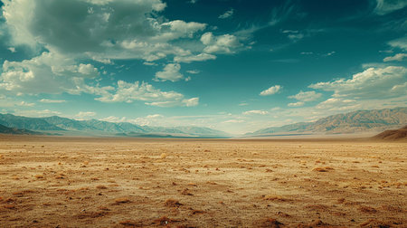 AI Generated. Wide shot of a vast arid desert landscape with wispy white clouds in the bright blue sky