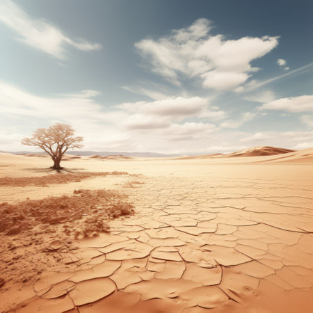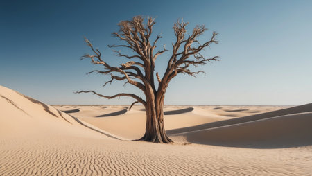 a lone tree stands tall amidst the vast expanse of the sahara desert, creating a striking image of post-apocalyptic futurism. the washed-out, photorealistic representation enhances the sense of desolation and environmental awareness. this terragen matte photo captures the essence of romantic dramatic landscapes, evoking a sense of awe and contemplation. ai generated