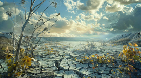 A barren landscape with cracked earth and wilted plants, symbolizing the impact of global warming