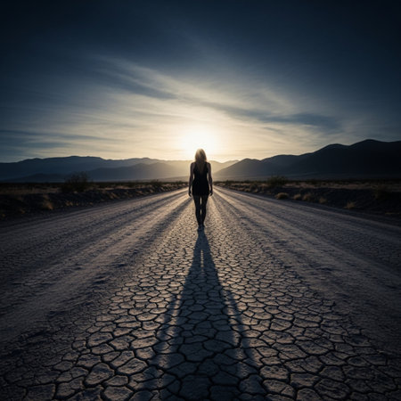 a woman stands in a dry desert, showcasing a surreal introspection. this captivating photograph, shot in 8k resolution, captures the essence of taylor wessing's adventure-themed collection. the image beautifully depicts trapped emotions, while the contrasting elements of long distance and deep distance create a mesmerizing blend of metropolis and nature. ai generated