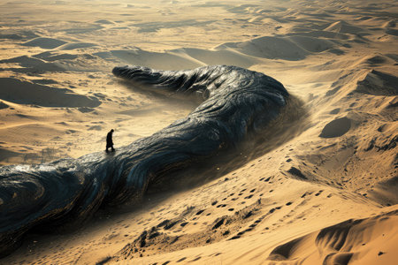 Huge Sand Worm, Giant Sandworm Raising Up From the Desert Depths, Little Man in Black Rushing on a Monster Through Desert, Generative AI Illustration