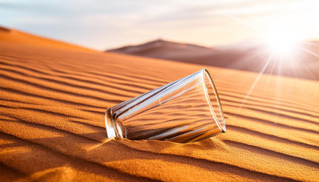 Extreme close-up of an empty drinking glass half-submerged in the desert sand. Concept of drought, global warming, climate change, ecology and environmental issues. Generative Ai.