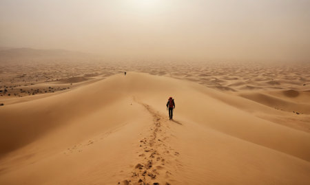 A lone hiker walks across the vast Sahara Desert, navigating the sand dunes under a hazy sky