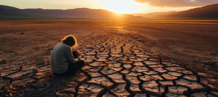 Girl sits on cracked ground near a dry river. Drought concept. Water crisis and arid environment. Generative AI.