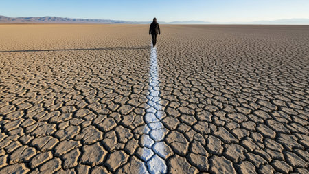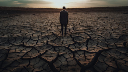 Rear view of a solitary man walking across a severely cracked and dry farmland at sunset. Powerful imagery illustrating drought, climate change, agricultural distress. Ideal for environmental topics
