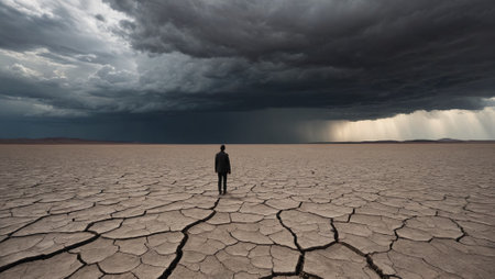 Man walking away from the camera on cracked and dry ground under dark cloudy sky, expressing concepts of climate change and despair