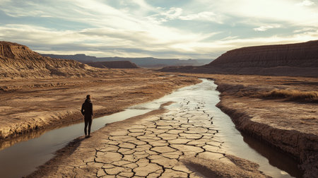 A person standing on a dry, cracked riverbed, looking out over the barren landscape.