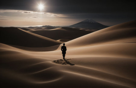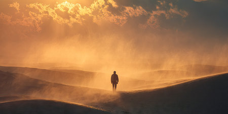A person is depicted as a silhouette in a landscape. The image features a desert environment with rolling hills and atmospheric fog. Warm color tones dominate the scene, created by the setting sun. Suitable for various uses including editorial content, advertising campaigns, and website design without specific location or brand associations.