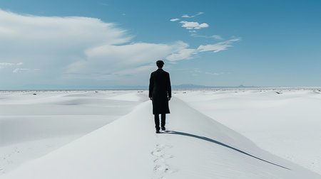 Man in Black Coat Walking on a White Sand Dune in a Vast, Desolate Landscape under a Wide Sky