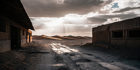 A desolate landscape with a sun setting in the background. The sky is filled with clouds, and the sun is just beginning to set. The scene is quiet and peaceful, with no signs of life