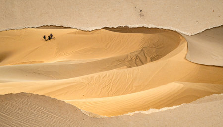 Revealing showing torn paper frame revealing vast golden sand dunes with tiny silhouettes of people. resolution...