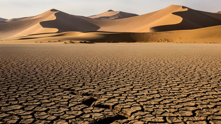 A landscape image contrasting parched, cracked earth in the foreground with smooth, rolling sand dunes in the background. The scene is bathed in warm sunlight, emphasizing the arid and desolate nature of the desert environment. This composition highlights textures of drought and vast wilderness.