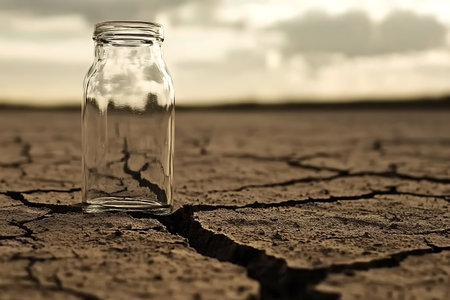 An empty glass jar stands on barren cracked soil, highlighting the severe impact of drought and water scarcity on the environment and agriculture.