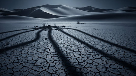 A barren landscape with cracked ground, the deep fissures in the soil highlighting the devastating impact of drought on the environment.