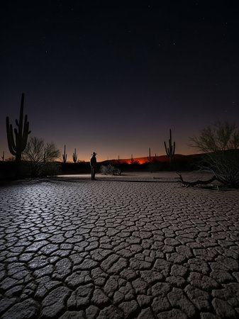 A solitary figure stands in a vast, dry, cracked desert at night, illuminated by a flashlight beam, with saguaro cacti and a distant orange glow on the horizon.