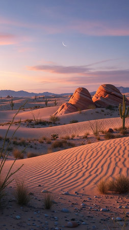 A tranquil desert scene unfolds at sunset, with soft light illuminating rolling sand dunes and sparse vegetation against a gradient sky of warm hues.