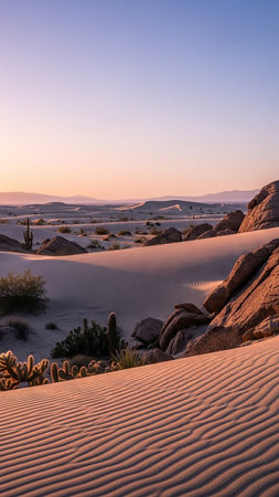 A tranquil desert landscape at dawn, showcasing smooth sand dunes with ripple textures, large rocks, and sparse desert plants under a soft pastel sky.