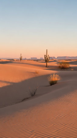 A serene desert landscape bathed in the soft, warm light of dawn, featuring rolling sand dunes, scattered cacti, and a pastel-colored sky.