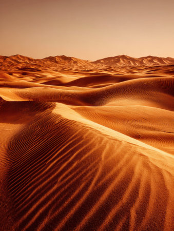 This breathtaking desert landscape captures rolling sand dunes and distant hills bathed in warm hues at sunset, creating a peaceful atmosphere ideal for relaxation.