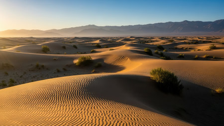 Waves of golden sand rise and fall across an expansive desert, glowing under a clear blue sky. The tranquil landscape invites a sense of calm and adventure, showcasing natures beauty.