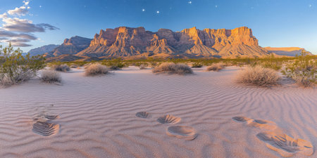 Desert Landscape Footprints Sand Dunes Majestic Mountains Sunset Sky day view arid wild rock blue