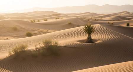 desert with rising sun, casting warm light and shadows onto the landscape, created with generative ai