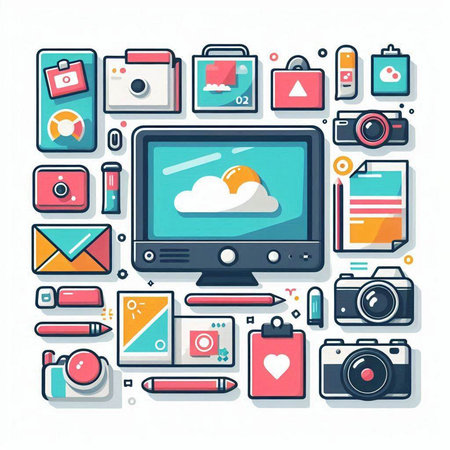 Photography equipment flat icons set. Vector illustration of camera, lens, flash, flash, compact disk, camera, flash, mirrorless camera, photo editing.